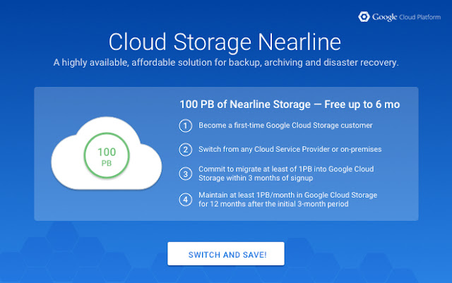 storage in Cloud Storage Nearline for up to 6 months. As a new Google Cloud Platform customer, you will be able to switch from any other Cloud Service Provider or on-premises infrastructure and significantly reduce your storage costs. We’ve also created a